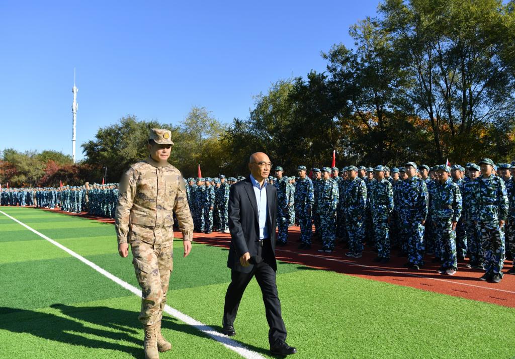 在庄严的国歌声中,军训闭营仪式正式开始。任庆国在驻训部队政治指导员夏伟的陪同下检阅受训方队。