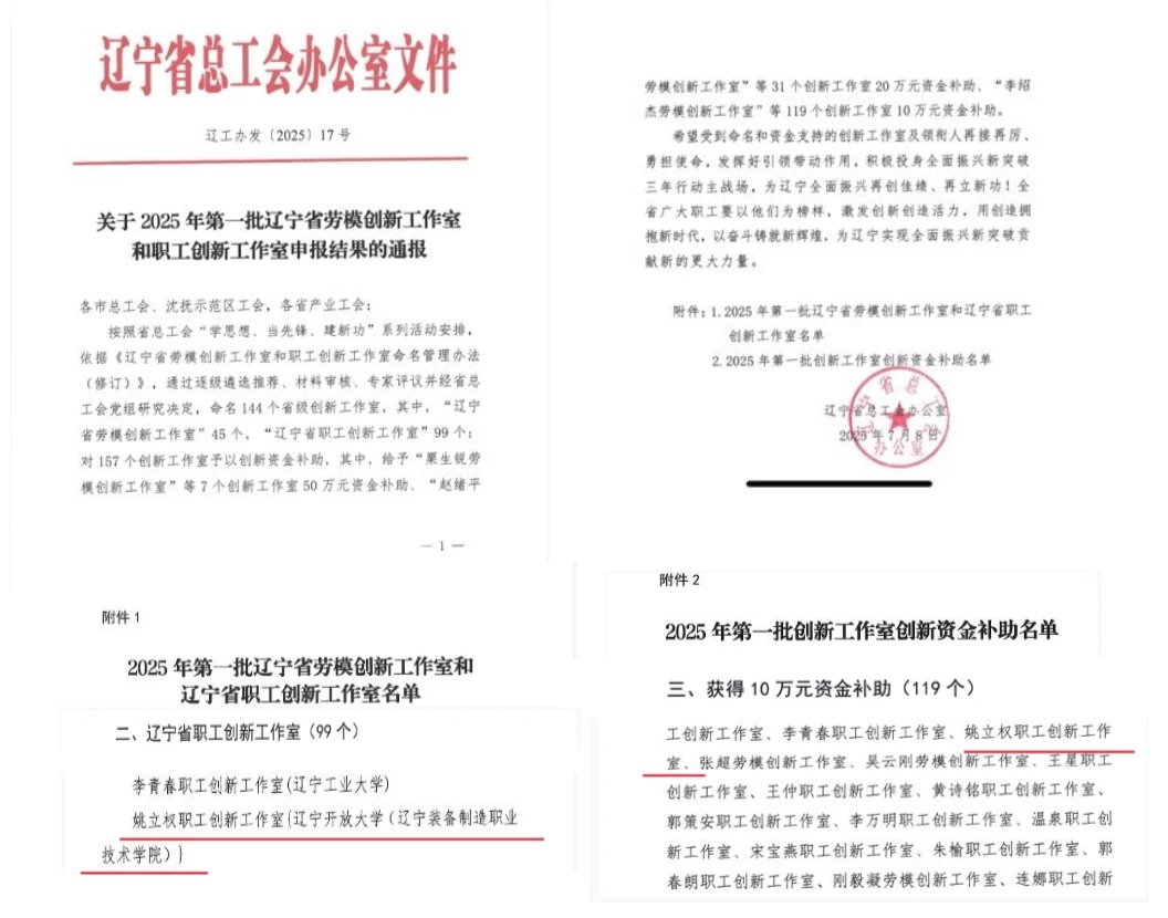 此次共命名 144 个省级创新工作室(其中 “辽宁省职工创新工作室” 99 个),并对 157 个创新工作室予以创新资金补助。姚立权职工创新工作室凭借扎实的创新实践、突出的成果成效及较强的示范引领作用,成功入选并获得资金支持。