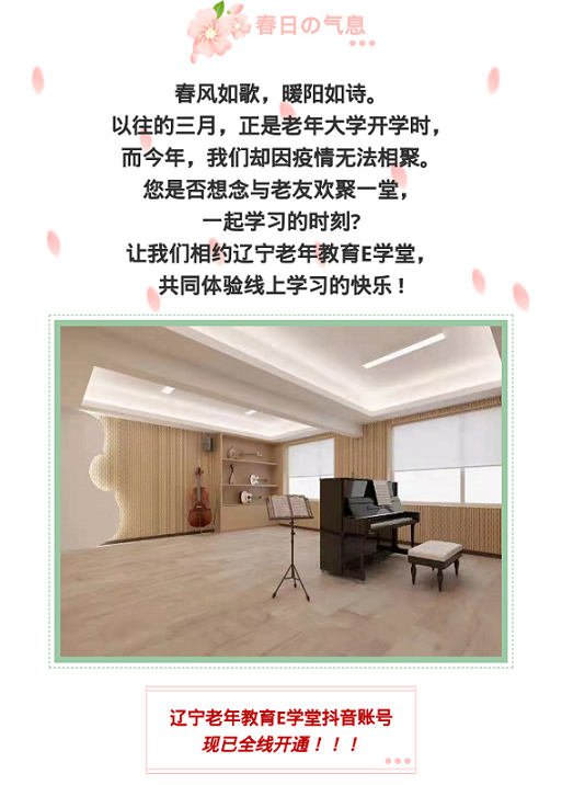 春风如歌,暖阳如诗。阳春三月,正是昔时老年大学开学季,然而壬寅仲春,却因“新冠”病毒的再度肆虐,各地老年大学延迟开学,学员居家防疫。为确保疫情期间“停课不停学”,满足广大老年人求学求知愿望,辽宁开放大学开通“老年教育E学堂”官方抖音账号,面向全省老年人免费提供在线课程学习及服务。