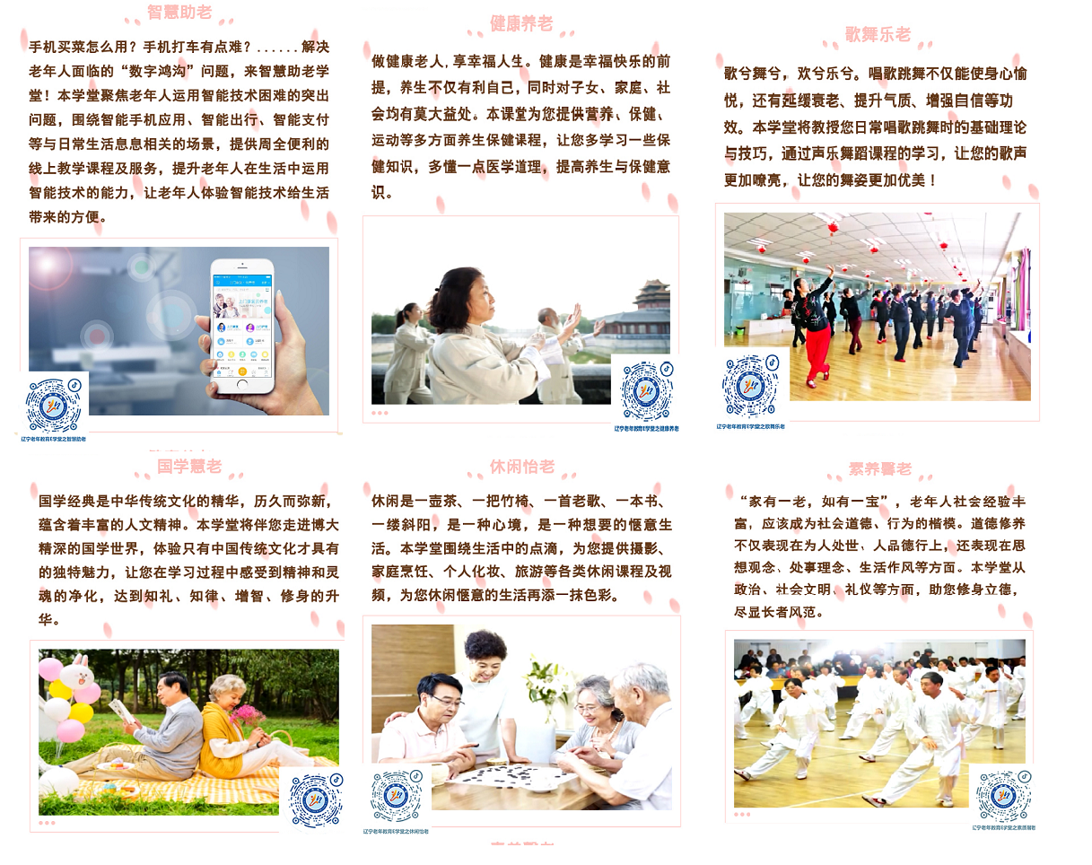 “辽宁老年教育E学堂”官方抖音账号涵盖六大板块:“智慧助老”、“健康养老”、“歌舞乐老”、“国学慧老”、“休闲怡老”和“素养馨老”。各板块围绕老年人日常生活中出现的高频事件和突出问题,有针对的为老年学员免费提供优质课程资源,保证了老年学员的在线自主学习,舒缓老年学员疫情居家期间的压力。