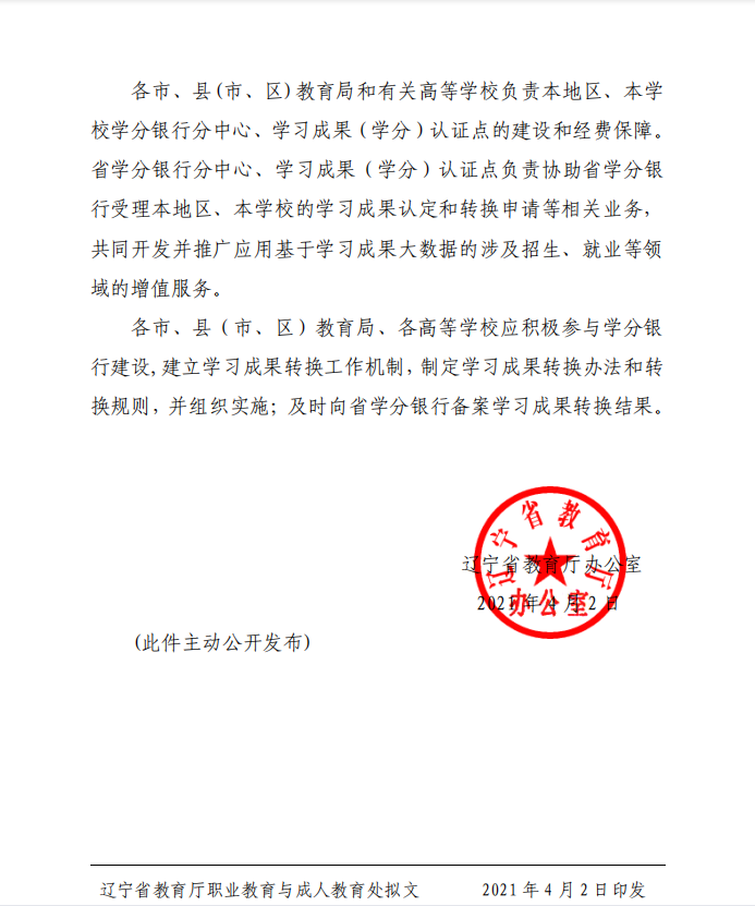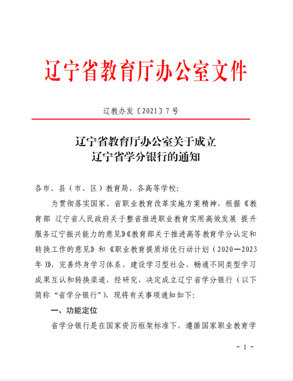 日前,辽宁省教育厅办公室发布《辽宁省教育厅办公室关于成立辽宁省学分银行的通知》(辽教办发【2021】7号),决定成立辽宁省学分银行。辽宁省学分银行在国家资历框架标准下,遵循国家职业教育学分银行建设规程建立,面向全体社会成员开展学习成果的存储、认定和转换管理与服务。