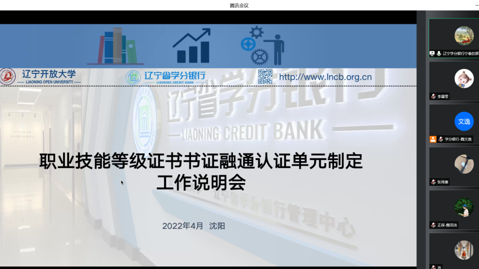 为贯彻落实辽宁省教育厅办公室发布的《关于进一步做好职业技能等级证书书证融通工作的通知》要求,推进本年度职业技能等级证书书证融通工作,4月29日,学分银行管理中心组织召开书证融通认证单元制定启动会暨培训会,会议通过腾讯视频召开,近80位培训评价组织负责人及相关专家参会,学分银行管理中心负责人宁春做专题报告。