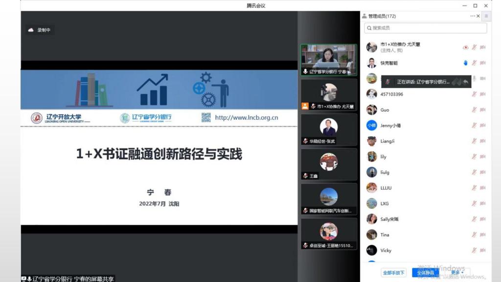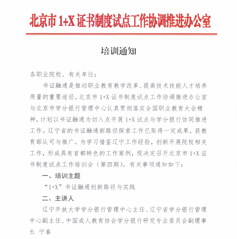 日前,学分银行管理中心受北京开放大学、北京市1+X证书制度试点工作协调推进办公室邀请,通过视频会议的方式分享辽宁省探索书证融通创新路径的成功经验。会议由北京市1+X证书制度试点工作协调推进办公室主办,北京市1+X试点院校分管1+X工作副校长、教务处处长、学院专业带头人及专业教师, 北京市学分银行联盟成员单位相关工作人员,北京市学分银行案例培育单位项目组成员,在京试点培训评价组织人员共计170余人参会。