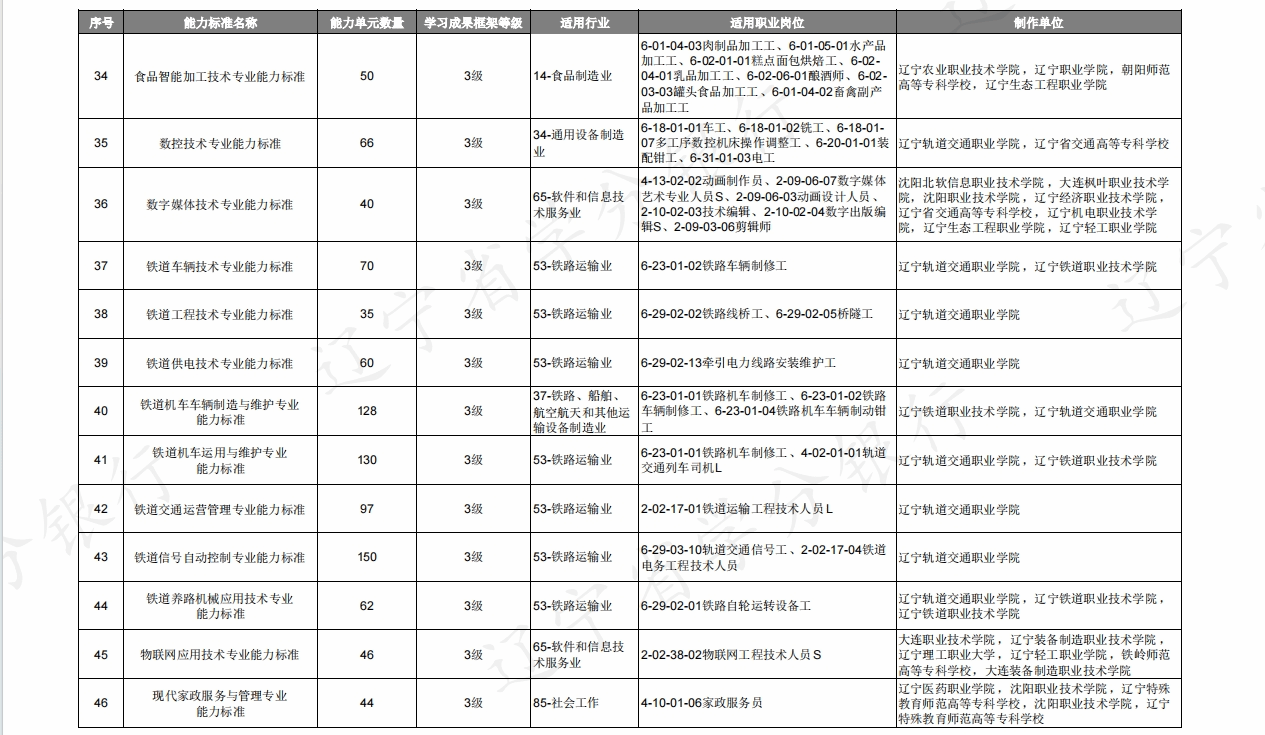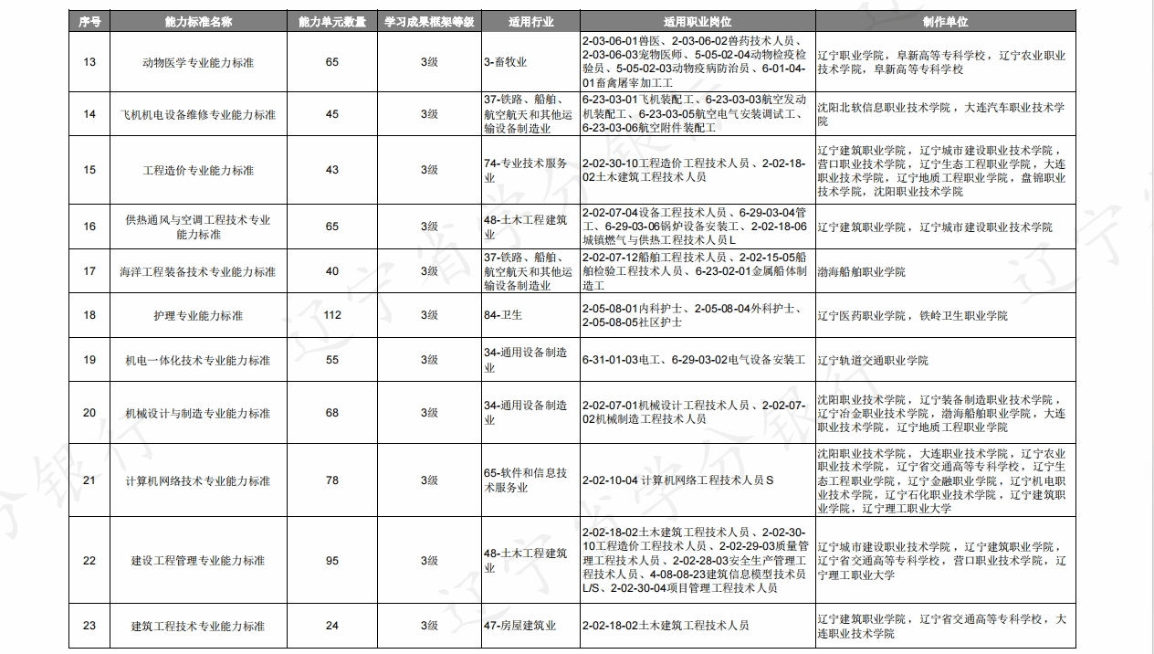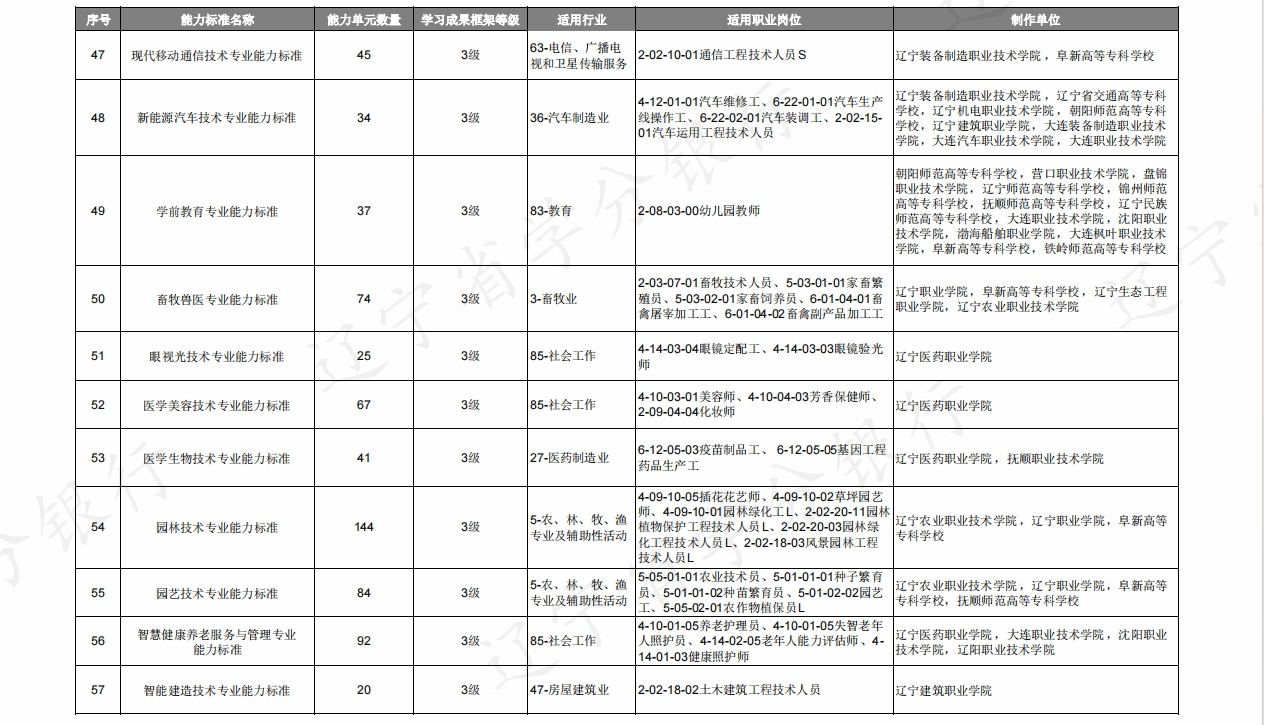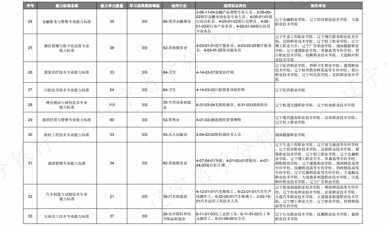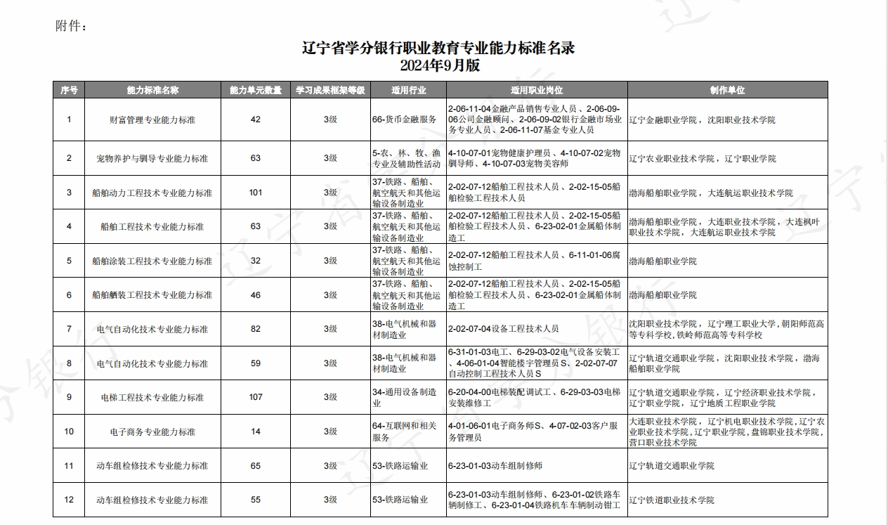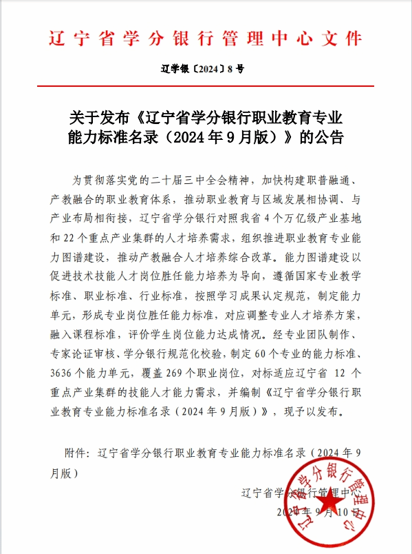 为贯彻落实党的二十届三中全会精神,加快构建职普融通、产教融合的职业教育体系,推动职业教育与区域发展相协调、与产业布局相衔接,辽宁省学分银行对照我省4个万亿级产业基地和22个重点产业集群的人才培养需求,组织推进职业教育专业能力图谱建设,推动产教融合人才培养综合改革。能力图谱建设以促进技术技能人才岗位胜任能力培养为导向,遵循国家专业教学标准、职业标准、行业标准,按照学习成果认定规范,制定能力单元,形成专业岗位胜任能力标准,对应调整专业人才培养方案,融入课程标准,评价学生岗位能力达成情况。经专业团队制作、专家论证审核、学分银行规范化校验,制定60个专业的能力标准、3636个能力单元,覆盖269个职业岗位,对标适应辽宁省 12 个重点产业集群的技能人才能力需求,并编制《辽宁省学分银行职业教育专业能力标准名录(2024年9月版)》,现予以发布。