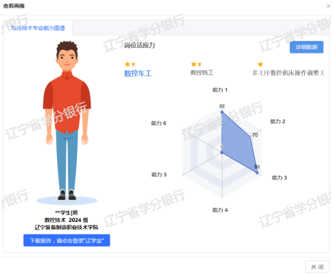 方式二:PC端 登录辽宁省学分银行专业能力图谱应用管理平台(https://nltp.lncb.org.cn/)进入学生端,点击“能力画像”点击“下载个人能力画像”,使用手机扫描“辽学宝”二维码,查收个人能力画像报告!