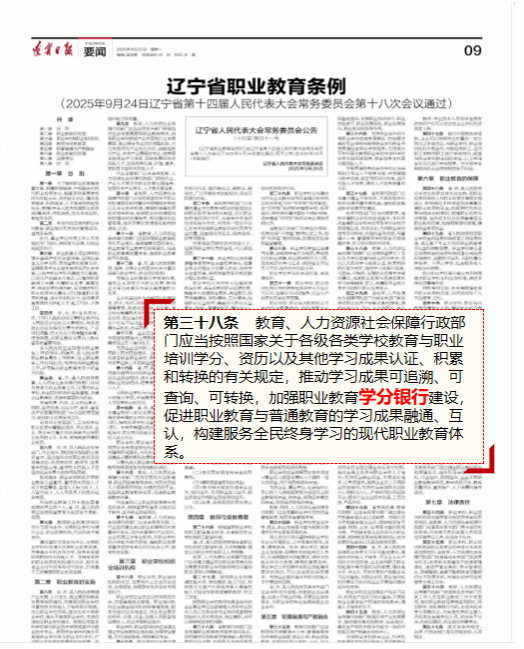 近日,辽宁省十四届人大常委会第十八次会议表决通过了《辽宁省职业教育条例》(以下简称《条例》),将于2025年12月1日起施行。《条例》紧紧围绕解决我省职业教育发展中存在的突出问题,通过全面系统地规范优化职业教育学校布局、建立专业动态调整机制、推进职普融通、促进产教融合等方面内容,着力增强法规的针对性和可操作性,为推动我省职业教育高质量发展,建设教育强省、科技强省、人才强省和技能型社会提供法治保障。