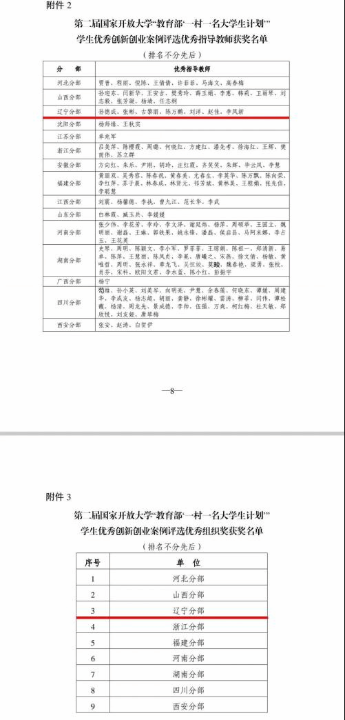 根据《关于开展第二届国家开放大学“教育部‘一村一名大学生计划’” 学生优秀创新创业案例评选活动的通知》要求,我校经过认真筛选和审核,在大量优秀案例作品中,报送9个案例进行评选。经专家评审和公示,由孙德成和张彬老师指导的《黑土地红草莓,红遍前杜村一前杜特色草莓小镇创业项目》喜获二等奖,由古黎丽、陈万鹏、刘洋、赵佳和李凤新老师分别指导的5个项目获得了优秀奖,孙徳成等7名老师获得了优秀指导教师的称号,学校获得优秀组织奖。